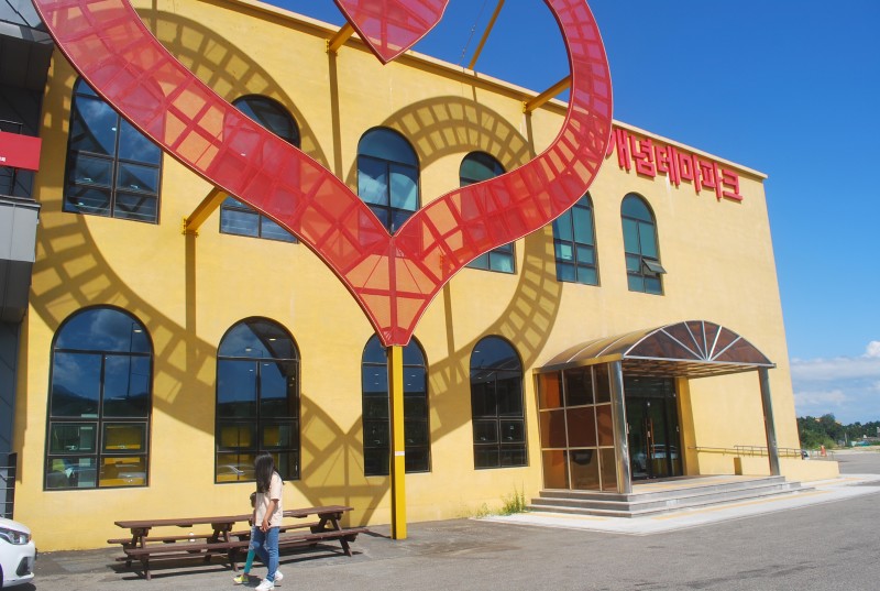 건물 외관은 노란색이며, 대형 하트 구조물이 붙어있어 호기심을 자아냅니다.