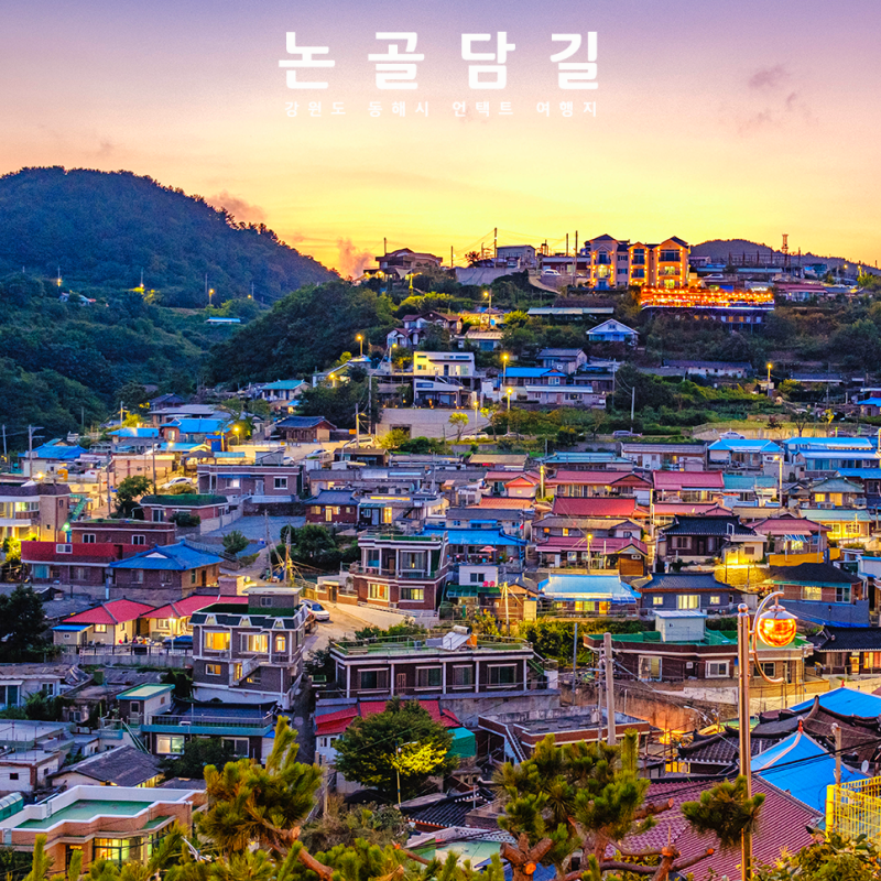 논골담길은 한국의 전통 마을을 지나 주변 산의 멋진 경관을 제공하는 시골길입니다.